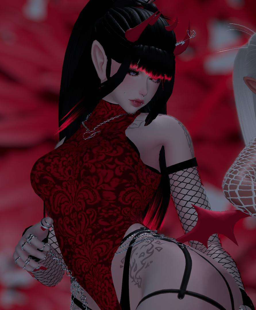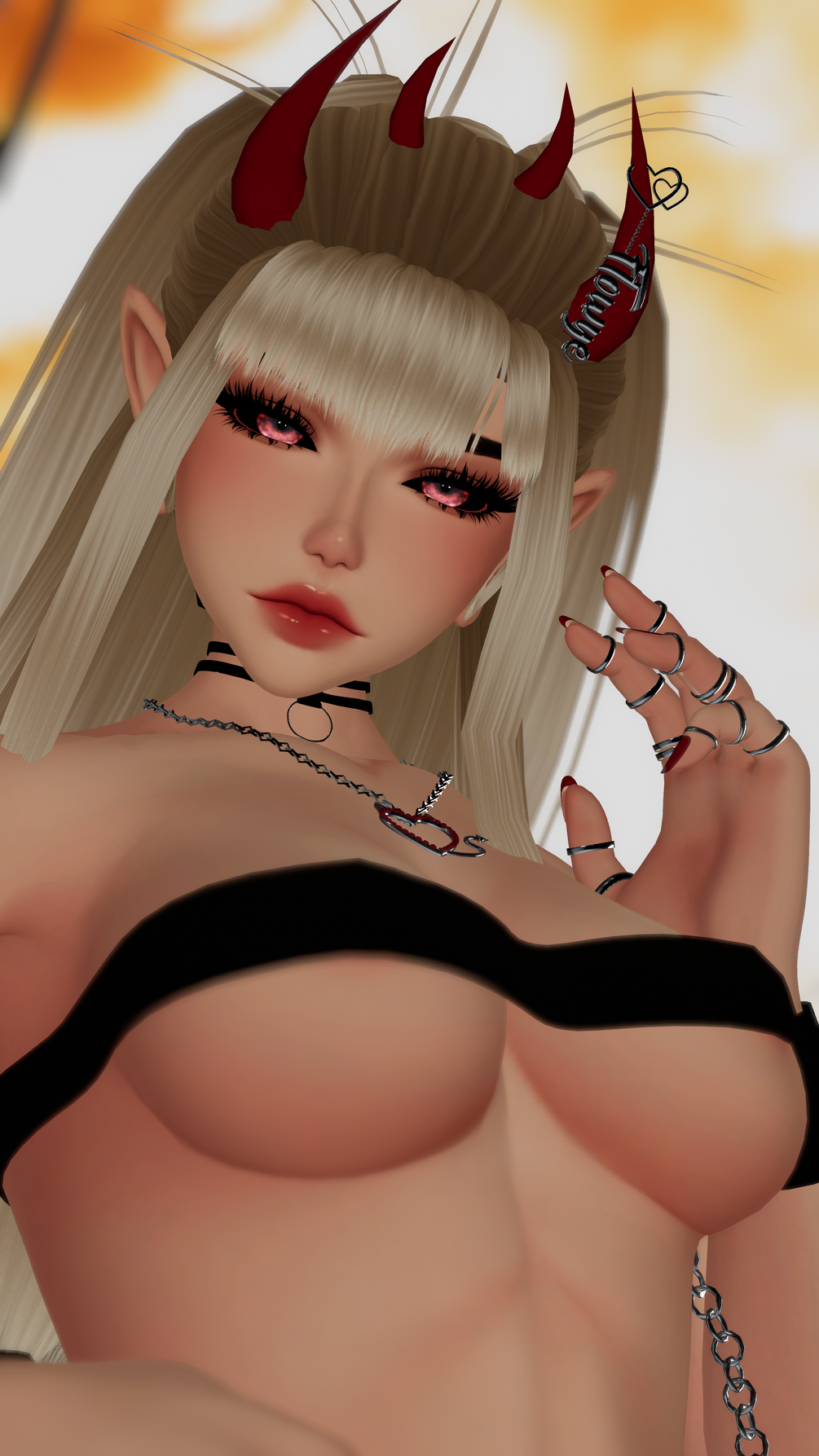 Accessories: Harness , Wings , Tail , Fork , Horns , Choker , Mouth cloth , Face piercings , Necklace , Arm sleeves , Ankle cuffs , Arm cuffs .