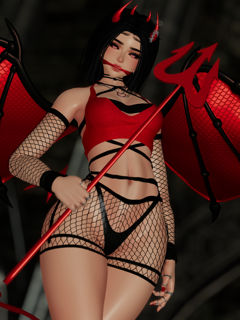 Accessories: Harness , Wings , Tail , Fork , Horns , Choker , Mouth cloth , Face piercings , Necklace , Arm sleeves , Ankle cuffs , Arm cuffs .