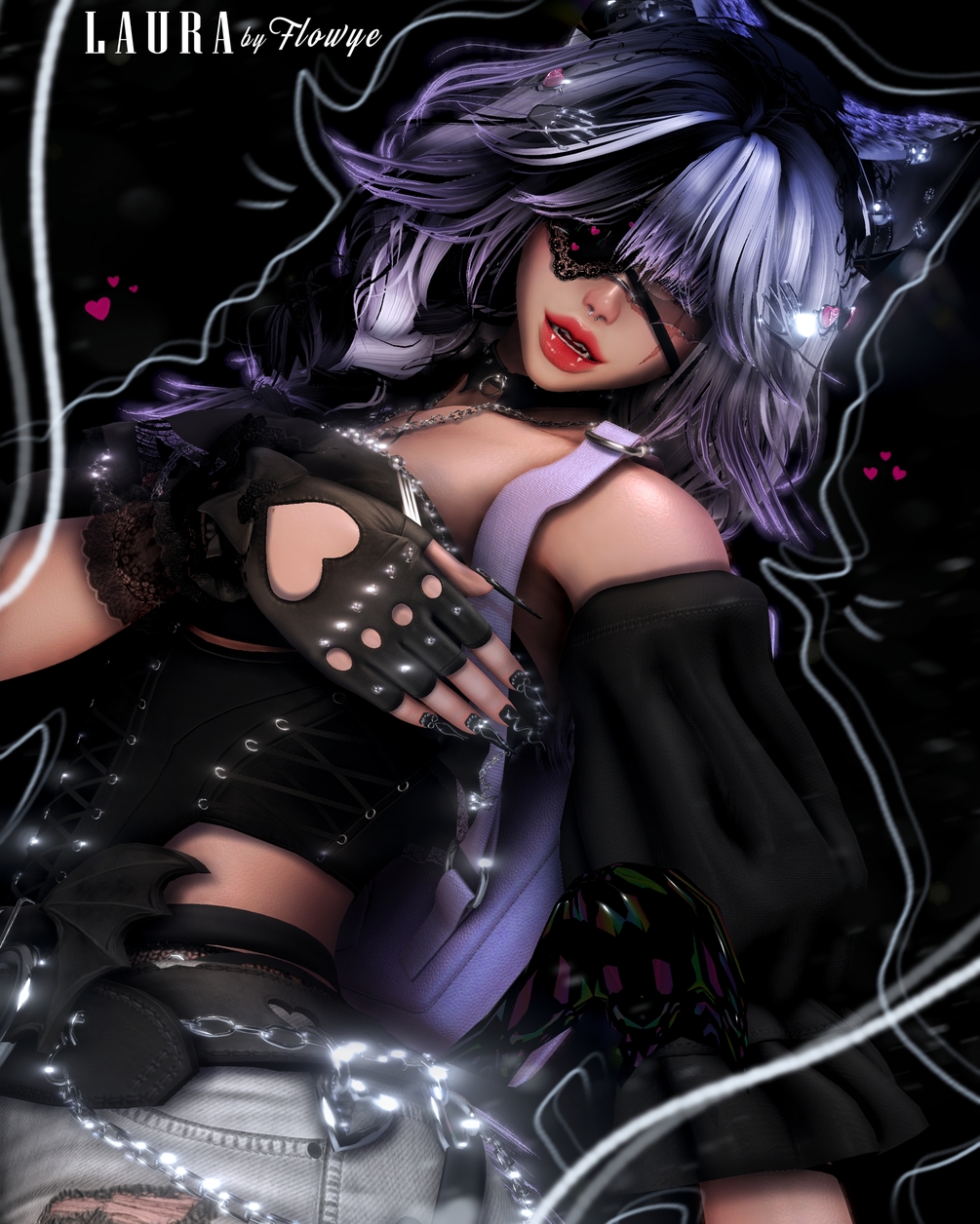 Accessories: Wrist laces ; Puffy sleeves ; Bat strings ; Backpack ; Belt ; Face Piercings ; Choker ; Earrings ; Cat Ears ; Garter ; Glasses ; Belt ; Hips chain ; Leg ribbon ; Top harness ; Rings ; Bottom harness ; Leg warmers ; Necklace ; Pom poms ; Body piercings ; Wings ; Pasties ; Tail ; Coffin bed follower ; Hand trails ; Bat follower ; Bubblegum system ; Corset ; Book ; Bat ears ; Earrings 2 ; Eyepatch ; Hair clips ; Skelly pins ; Head wings ; Headband ; Hair bows ; Functional Umbrella .