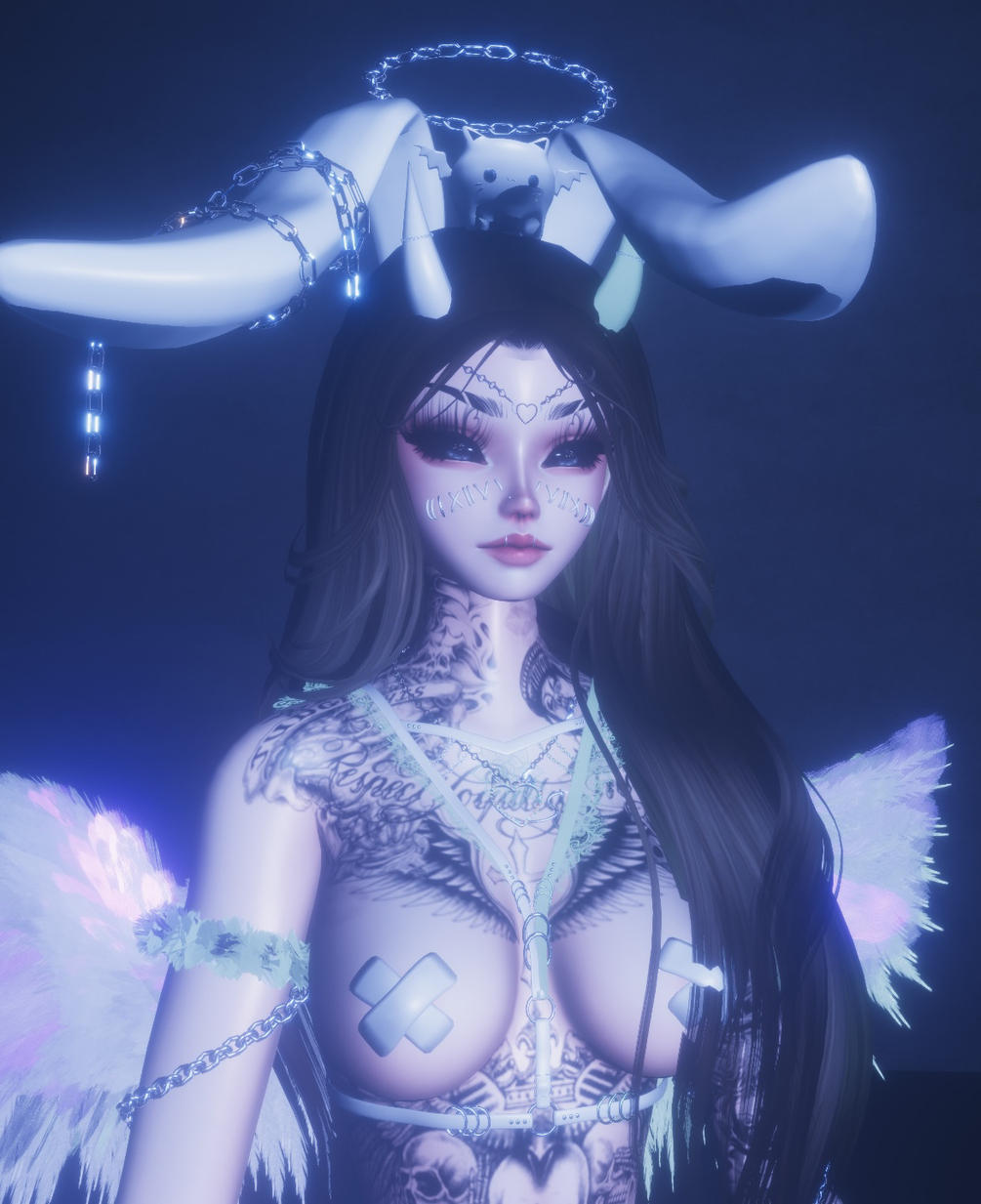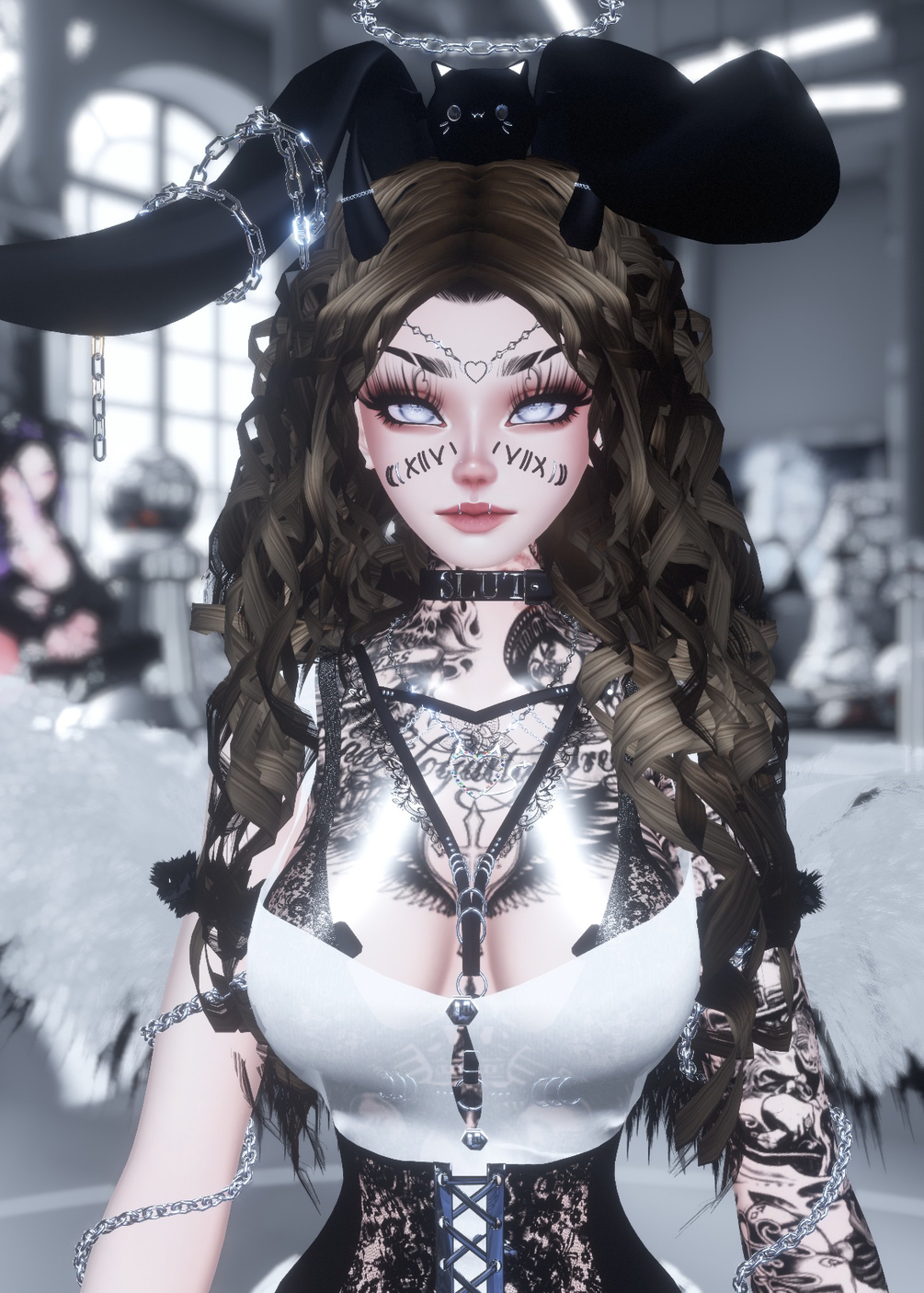 Accessories: Chest Harness ; Arm Chain ; Hand Chain ; Choker ; Face Piercings ; Body Piercings ; Blindfold ; Wings ; Phone ; Back laces ; Face Charm ; Face Lace ; Head Kitty ; Halo ; Necklace ; Corset ; Leg Harness ; Horns .