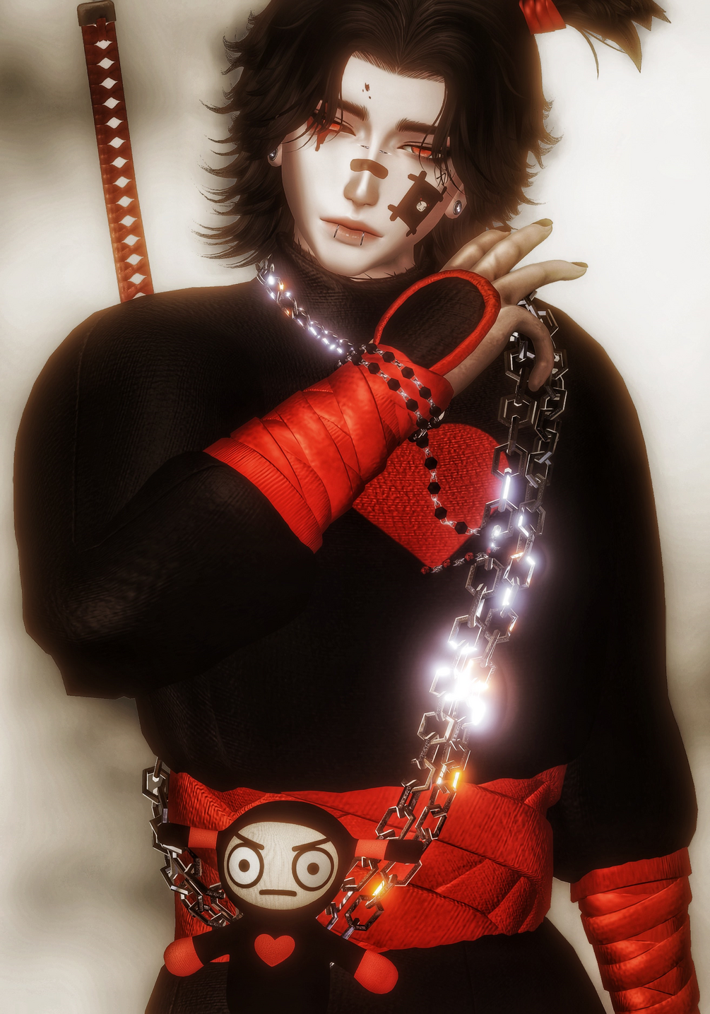 Accessories: Blindfold ; Gloves ; Arm Chains ; GARU necklace ; Septum ; Face Piercings ; Brow piercing ; Bracelet ; Katana harness ; VFX Katana ; Cat ears ; Cat tail ; Kitsune tails ; GARU plushie ; Body knifes ; Stitch choker ; Nose bandaid ; Cheek bandaid ; Hair pins ; Hand chain .